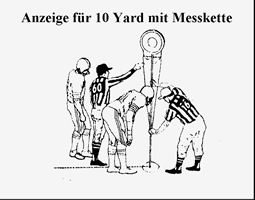 Die nötigen 10 Yards werden durch Markierungen am Spielfeldrand angezeigt. Ebenso die jeweilige Position des Balles nach jedem Spielzug und der wievielte Versuch für den Angriff läuft.